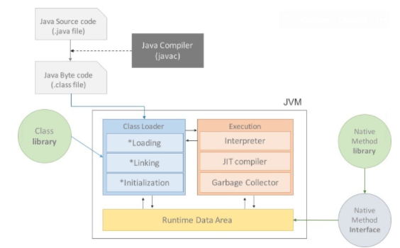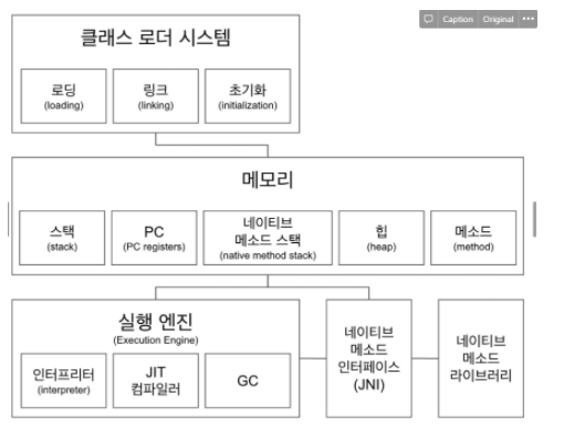 JVM의 구조는 Class Loader, Execution Engine, Runtime Data Area, JNI, Native Method Library로 이루어져 있다.