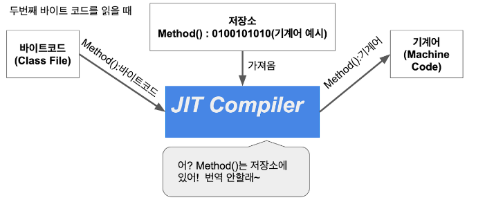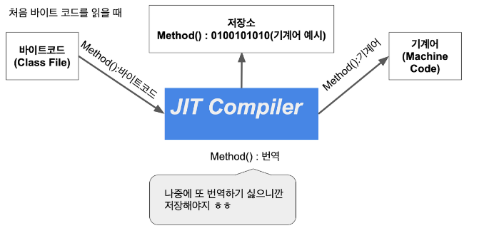 인터프리터의 속도 이슈를 해결하기 위해 같이 사용한다. 자주 실행되는 바이트 코드 영역을 런타임 중에 기계어로 컴파일하여 사용한다.