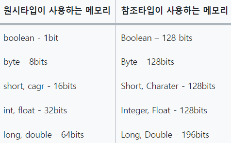 원시타입보다 참조타입이 사용하는 메모리 양이 압도적으로 높다. 이외의 참조타입은 최근 들어 64비트의 JVM을 많이 사용하므로 일반적으로 64비트를 차지한다고 한다.