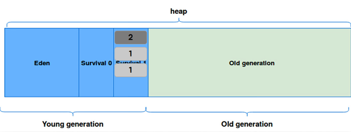 Young Generation은 또 다시 Eden, Survival 0, Survival 1 영역으로 나뉜다. Eden 영역은 새롭게 생성된 객체들이 할당되는 영역이고, Survival 영역은 minor GC에서 살아남은 객체들이 존재하는 영역이다. 이때 Survival 영역에서 Survival 0, Survival 1 중 하나는 꼭 비어 있어야 한다는 규칙이 있다.