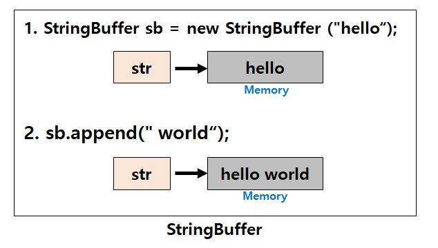 직관적이어서 가장 많이 사용할 듯한 위의 예제에서 "hello" 값을 가지고 있던 String 클래스의 참조변수 str이 가리키는 곳에 저장된 "hello"에 "world" 문자열을 더해 "hello world"로 변경한 것으로 착각할 수 있다.