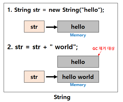 하지만 기존에 "hello" 값이 들어가있던 String 클래스의 참조 변수 str이 "hello world":라는 값을 가지고 있는 새로운 메모리 영역을 가리키게 변경되고 처음 선언했던 "hello"로 값이 할당되어 있던 메모리 영역은 Garbage로 남아있다가 GC에 의해 사라지게 되는 것이다. String 클래스는 불변하기 때문에 문자열을 수정하는 시점에 새로운 String 인스턴스가 생성된 것이다.