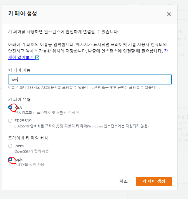 키 페어 이름을 입력하고 키 페어를 생성하면 된다. 키 페어 유형은 RSA, 프라이빗 키 파일 형식은 .ppk로 설정하면 ppk확장자로 다운이 된 것을 알 수 있다. 이것은 putty로 서버에 들어갈 때 사용될 것이니 고이 모셔두자