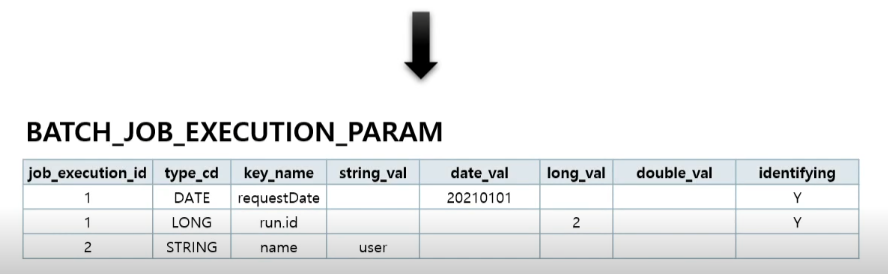 예를 들어서 위의 그림에서 세개의 파라미터가 들어갔는데요 requestDate, run.id, name 입니다. 이것이 BATCH_JOB_EXECUTION_PARAM 테이블에 이렇게 매핑 됩니다.