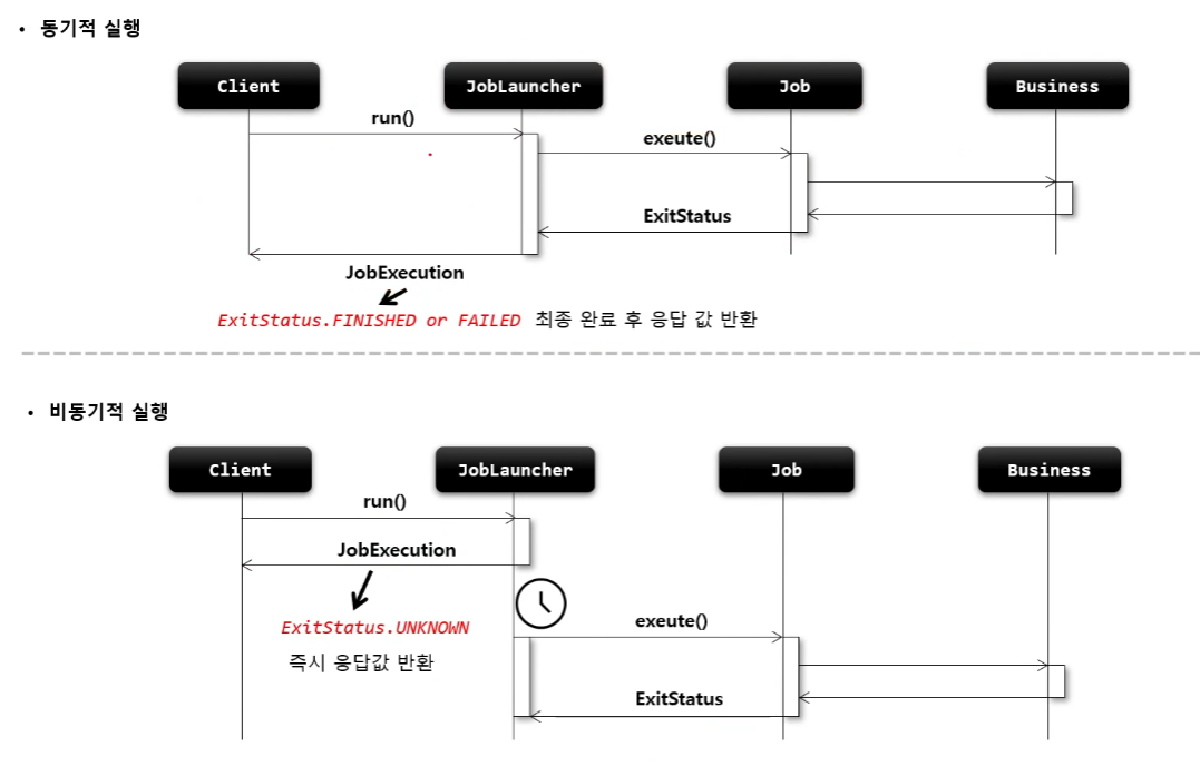 위에서도 언급되어있지만 동기적 실행은 JobExecution을 획득하고 배치 처리를 최종 완료한 이후 Client 에게 JobExecution을 반환합니다. 비동기적 실행은 JobExecution을 반환하고 배치 처리를 완료하죠.