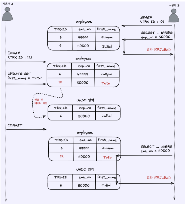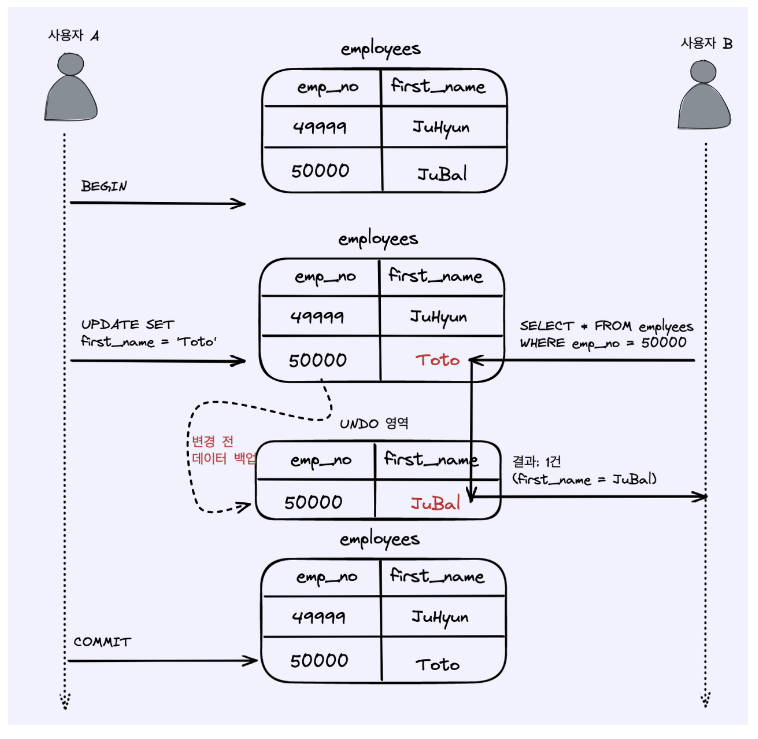 사용자 A가 emp_no = 50000인 사원의 이름을 변경하는 과정에서 사용자 B가 emp_no = 50000인 사원을 SELECT 할 때 어떠한 과정을 거쳐서 처리되는지 보여줍니다.