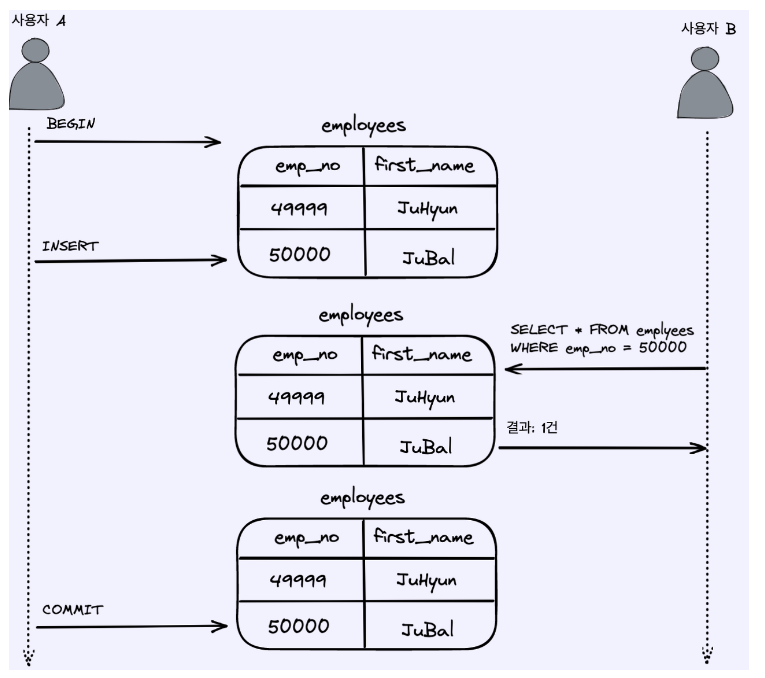 위 그림에서 사용자 A는 emp_no = 50000, first_name = "JuBal" 인 새로운 사원을 INSERT 하고 있습니다. 그리고 사용자 B는 변경된 내용을 커밋하기도 전에 emp_no = 50000 인 사원을 검색하고 있습니다. 하지만 사용자 B는 사용자 A가 INSERT한 사원의 정보를 커밋되지 않은 상태에서도 조회를 할 수 있습니다.