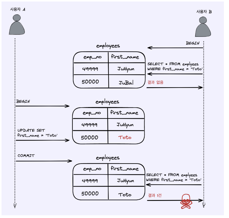 위 그림에서 사용자 B가 BEGIN 명령으로 트랜잭션을 시작하고 first_name = "Toto"인 사원을 조회하면 일치하는 데이터 값이 존재하지 않습니다.