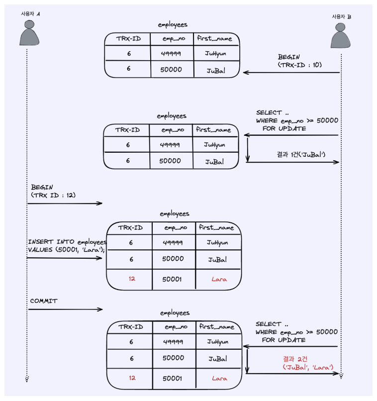 하지만 위 그림에서 사용자 B가 실행하는 두번의 SELECT ... FOR UPDATE 쿼리 결과는 서로 다릅니다. 이렇게 다른 트랜잭션에서 수행한 변경 작업에 의해 레코드가 보였다 안보였다 하는 현상을 PHANTOM READ 라고 합니다.