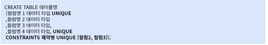 - 테이블을 만들 때 제일 밑에 CONSTRAINTS 제약명 UNIQUE (컬럼2, 컬럼3) 과 같이 CONSTRAINTS의 이름을 지정이 가능합니다.