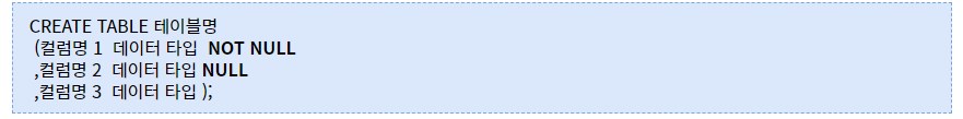- NULL이 기본 값이므로 NULL을 명시해주는 컬럼 2와 NULL을 명시해주지 않은 컬럼 3은 동일하다고 보시면 됩니다.