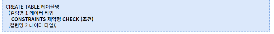 - CHECK는 조건에 부합하는 데이터만 입력이 가능하도록 하는 제약조건입니다.