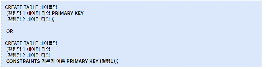 - 기본키는 NOT NULL + UNIQUE의 속성을 가집니다. 즉, NULL값이 있으면 안되고 해당 컬럼의 데이터는 중복되지 않고 유일해야 합니다.