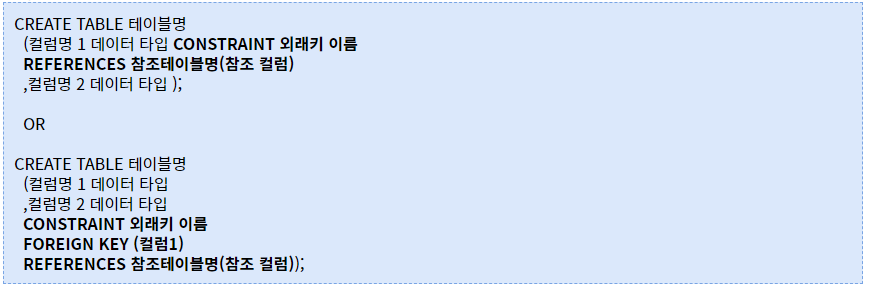 - 외래키를 명시하는 방법은 위와 같이 두가지가 있으며 동일합니다. 다만 아래쪽은 외래키의 이름을 지정해줄 수 있습니다.