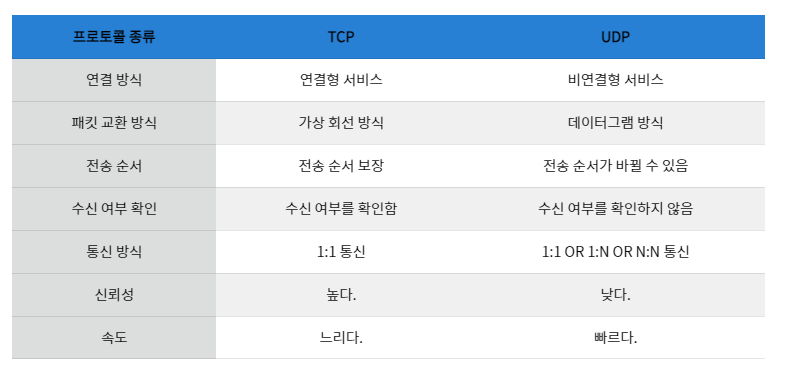 TCP는 연속성보다 신뢰성 있는 전송이 중요할 때 사용되는 프로토콜이며, UDP는 TCP보다 빠르고 네트워크 부하가 적다는 장점이 있지만, 신뢰성 있는 데이터 전송을 보장하지는 않는다. 그렇기 때문에 신뢰성보다는 연속성이 중요한 실시간 스트리밍과 같은 서비스에 자주 사용된다.