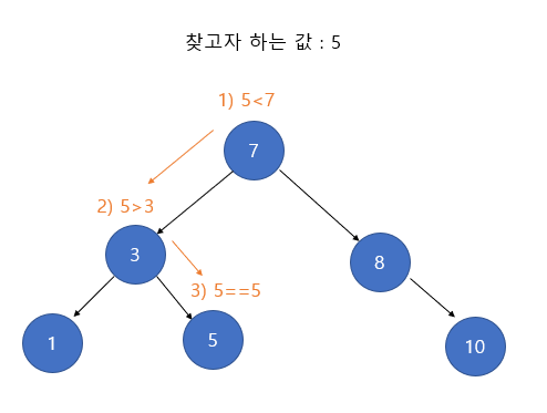 원하는 값이 5고 첫번째 값이 7인데 5가 왼쪽이 아니고 오른쪽 두번째에 있으면 그게 더 빠른건데 오른쪽으로 가지않고 굳이 값이 작으면 왼쪽으로 가는 이유는 무엇일까요?