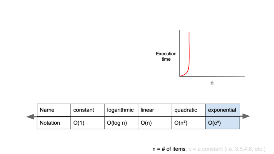 O(2^n)은 기하급수적 복잡도라고 부르며, 빅-오 표기법 중 가장 느린 시간 복잡도를 가집니다. (물론 이론상 O(n!) 이 가장 느리긴 하지만 n! 은 현실세계에서 존재하지 않는다고 봐도 될정도로 적은 시간복잡도입니다.)