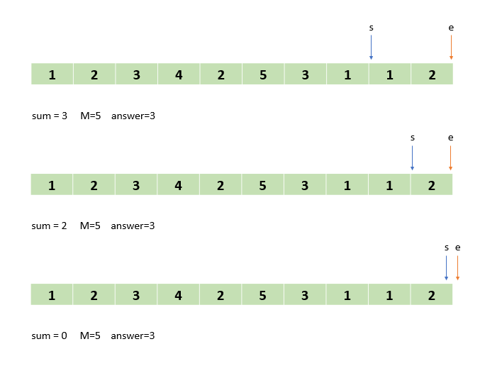 즉, 맨 처음에는 s 와 e 가 0이며 항상 s <= e 를 만족해야 합니다. 2개의 포인터는 현재 부분 배열의 시작과 끝을 가리키는 역할을 합니다.
