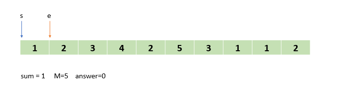 s 와 e 가 같기때문에 e 를 하나 증가시켰습니다. 이렇게 되니 부분합이 1이 됐네요. 부분합이 목표값인 M보다 작기 때문에 e 를 하나 더 증가시킵니다.