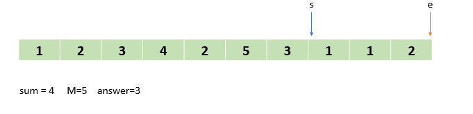 - 만약 현재 부분합이 M 이상이거나 이미 e = N (e 가 끝에 닿으면) s를 하나 증가시킵니다.
