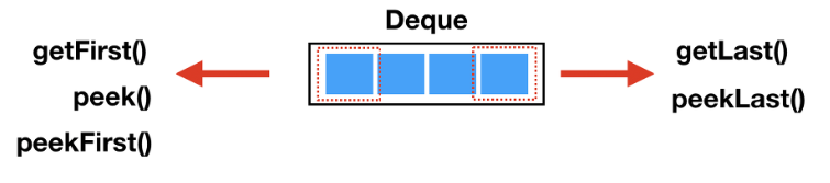 - peekFirst() : 데크의 앞쪽 element를 하나 제거하지 않은 채 리턴한다. 데크가 비어있으면 null이 리턴된다.