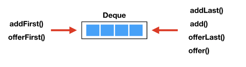 - addLast() : 데크의 마지막 쪽에 element를 삽입합니다.용량 제한이 있는 경우 용량 초과시 예외가 발생합니다.