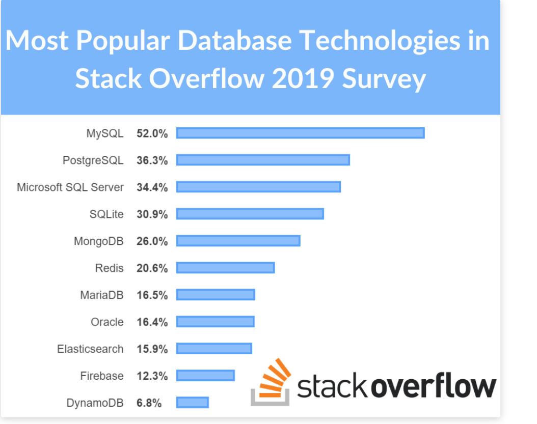 PostgreSQL의 인지도를 알기 위해서 조사를 좀 해보니 StackOverFlow의 실무에서 일하는 개발자를 대상으로 설문조사를 한 적이 있는데 거기서 PostgreSQL이 2등을 했다고 합니다.
