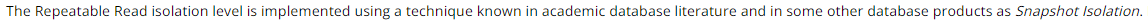 격리수준에 대한 내용에서도 Phantom Read에 대한 내용은 코빼기도 보이지 않더군요. 심지어 Repeatable Read는 학술적인 데이터베이스 문헌과 다른 데이터베이스에서 사용한 Snapshot Isolation을 이용해 구현했다. 라고 하더군요...