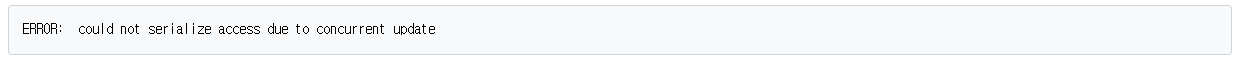 스냅샷 격리가 낙관적 락을 채택하고 있기 때문에 만약 두 트랜잭션에 의해 동시성문제가 발생하려고 하면 에러를 뱉습니다.