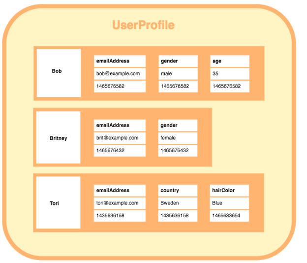 Wide-column 저장방식은 말그대로 column을 유연하게 설계할 수 있습니다. 어떤 데이터는 아이디-패스워드-이름을 저장할 수 있고, 어떤 데이터는 아이디-패스워드-이름-주민등록번호 이런식으로 column을 확장할 수 있습니다.