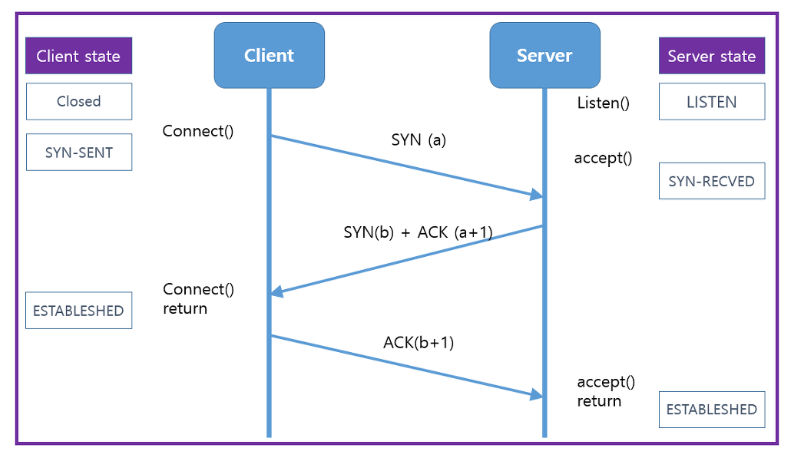 TCP는 가상회선 연결이 수립되는 과정이라고 생각하시면 됩니다. 클라이언트는 서버한테 요청을 할 수 있는지, 서버는 클라이언트에게 응답해줄 수 있는지 확인하는 과정이라고 생각하시면 되는데요.