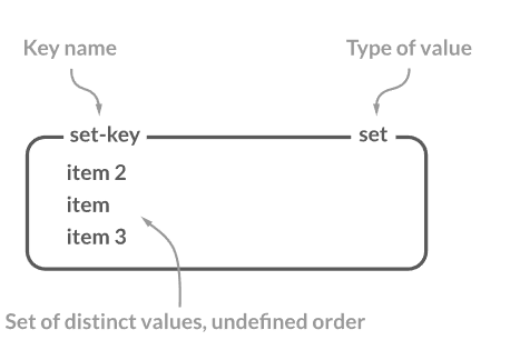 Set은 순서없는 String을 모아둔 컬렉션입니다. Set은 태그나 프로덕트 카테고리등과 같은 유니크한 값을 저장하기위해 사용됩니다. 해당 타입은 속도가 정말 빠르지만 순서가 없습니다.