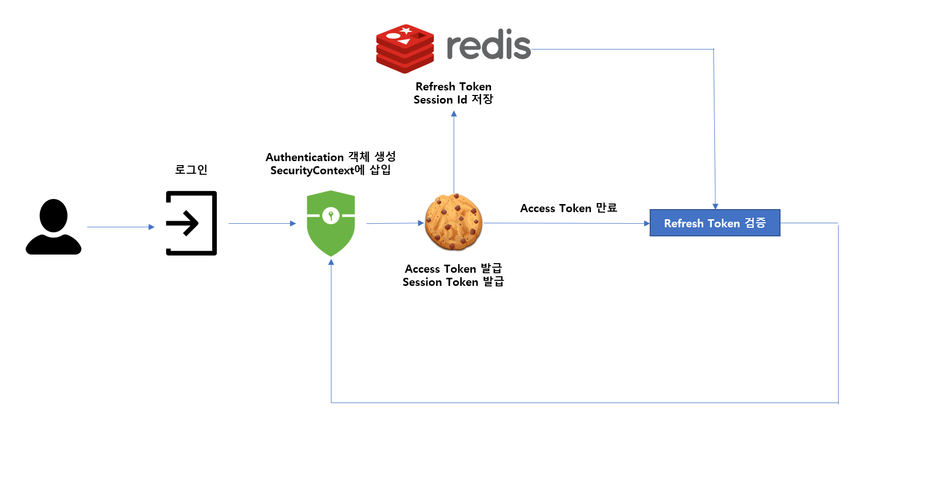 - Access Token이 null이고 = 쿠키가 만료되었고, Authentication 객체도 null 이다, 이런 경우엔 웹 페이지를 종료했다가 다시 들어온 사용자라는 얘기죠. 이럴땐 SESSION-TOKEN 쿠키를 확인해서 Redis에 있는 Refresh Token을 꺼내온다.