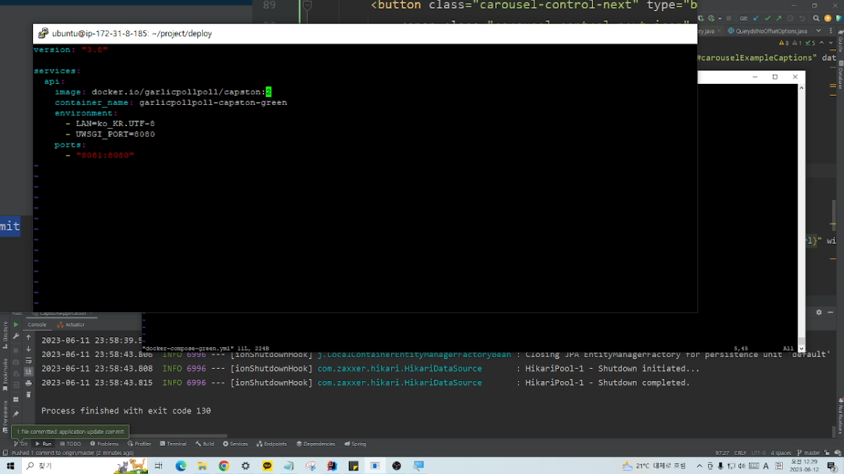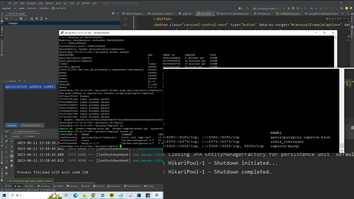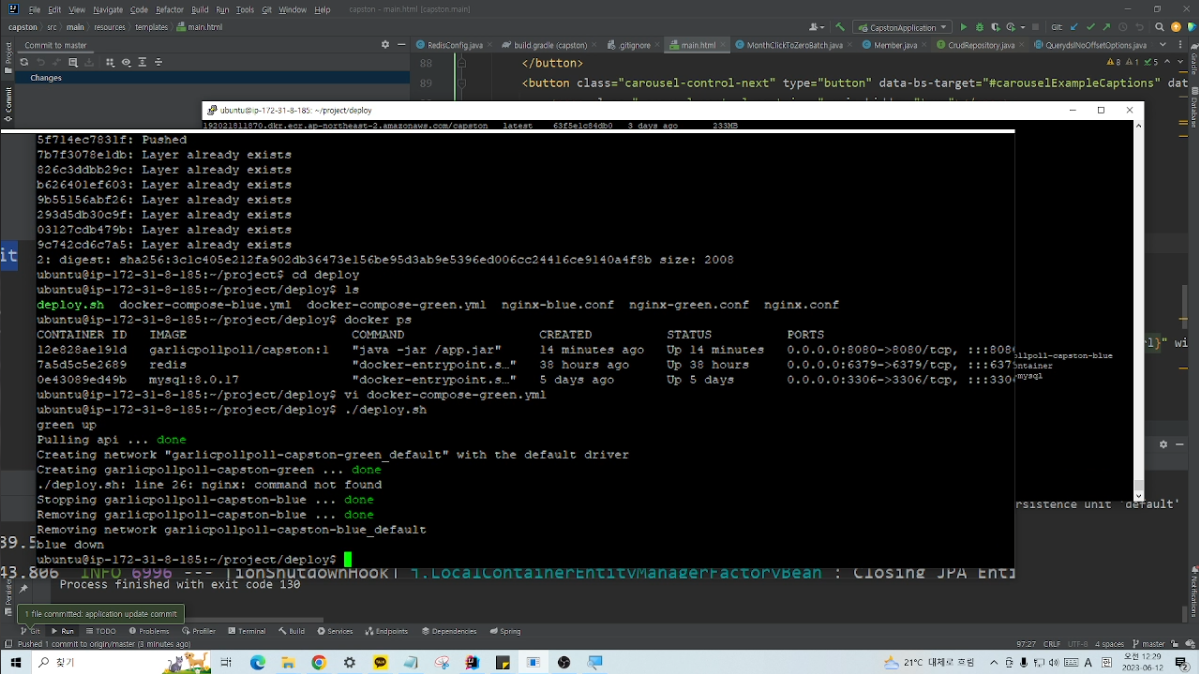 정상적으로 완료되었고 로그를 보시면 그린버전의 컨테이너를 만들고 블루버전의 컨테이너를 중지시킨 뒤 컨테이너를 삭제시켰습니다.