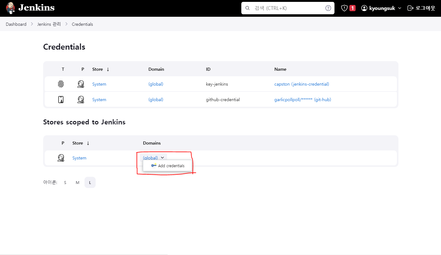우리는 우선 AWS의 private key와 git hub을 credential로 등록할겁니다. 그러기위해선 아래 보이는 스샷처럼 Jenkins 관리를 들어가줍니다.