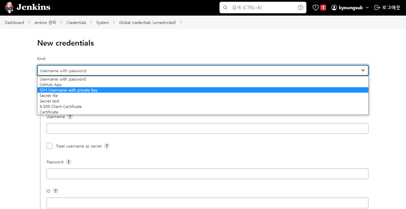 ID : 이 Credential의 고유 ID입니다. 저는 Github Credential이라고 적었습니다.