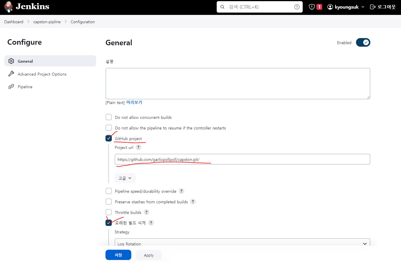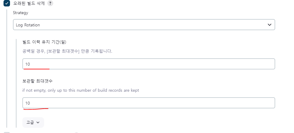 그리고 오래된 빌드 삭제를 누르시는데 이건 해도 되고 안해도 됩니다만 예전 로그까지 볼 필요는 없을 것 같아서 선택했습니다.