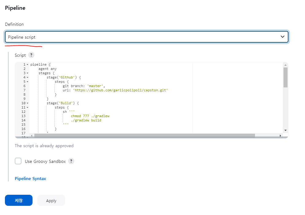 Definition을 Pipeline script로 선택해주시고 맨 아래 Use Groovy Sandbox를 선택 해제합니다.