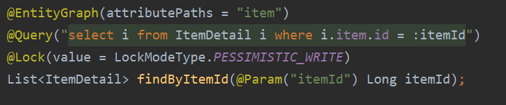 보통 Spring Data JPA를 사용한다면 @Lock 어노테이션으로 비관적 락을 걸 수 있습니다.