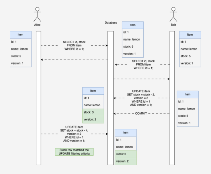 - 밥과 엘리스가 레몬을 조회한다. 재고 = 5, 버전 = 1