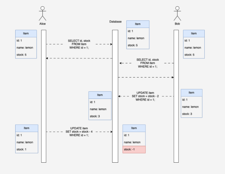 - 심각한 장애를 야기한다. (재고가 1개 있는데 3명이 1개씩 주문하면 재고가 0이 되면서 결제 로그가 세개 찍힘)