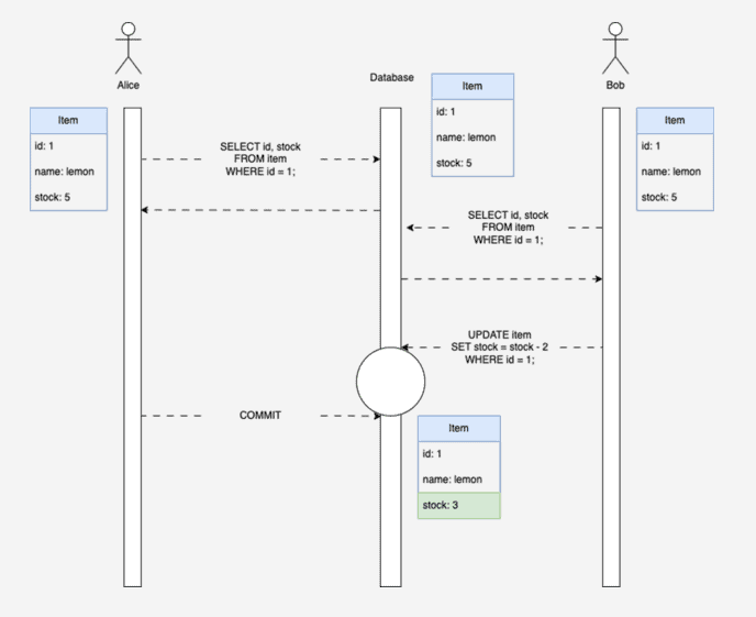 - 그러므로 엘리스가 업데이트를 하는 순간 레몬의 재고가 1로 변경