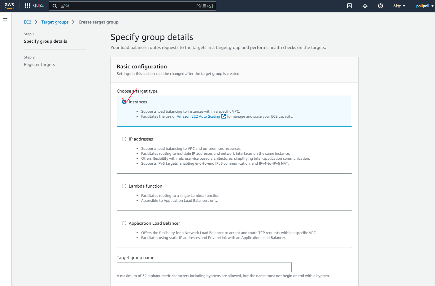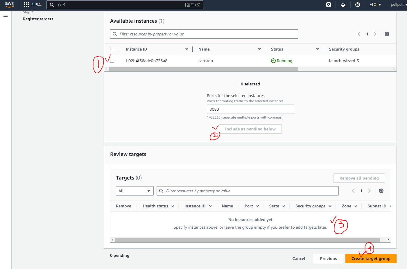 이 창이 나오는데 먼저 사용 가능한 EC2 인스턴스를 클릭하고 Include as pending below를 누릅니다. 그럼 3번에 선택된 인스턴스가 보여지게 되고 이후 Create target group을 누르면 됩니다.