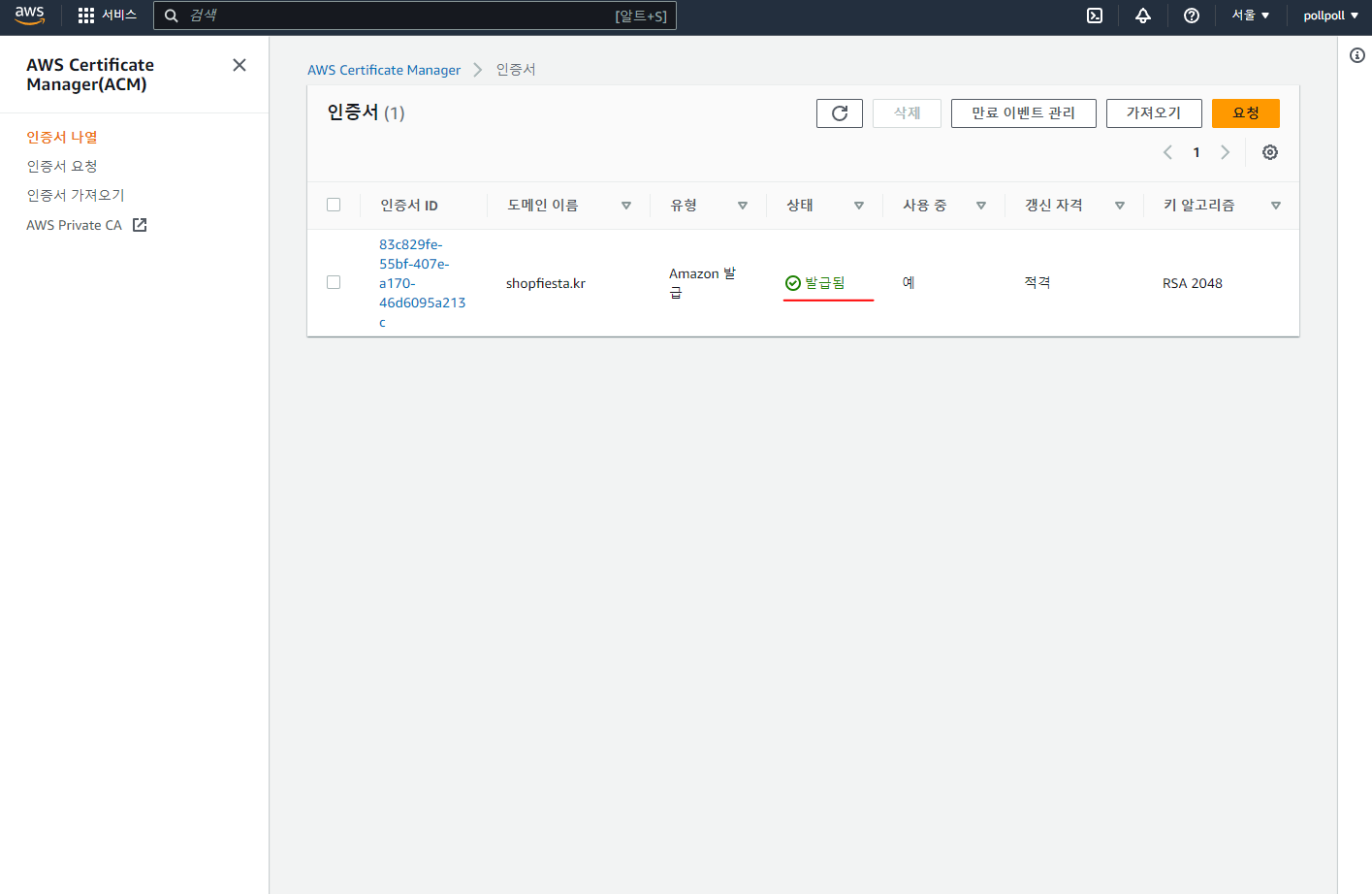 AWS 검색창에 ACM을 검색하면 Certificate Manager 라는 탭이 있습니다. 그곳에 들어가서 우리의 도메인이름으로 인증서를 발급받아야합니다.