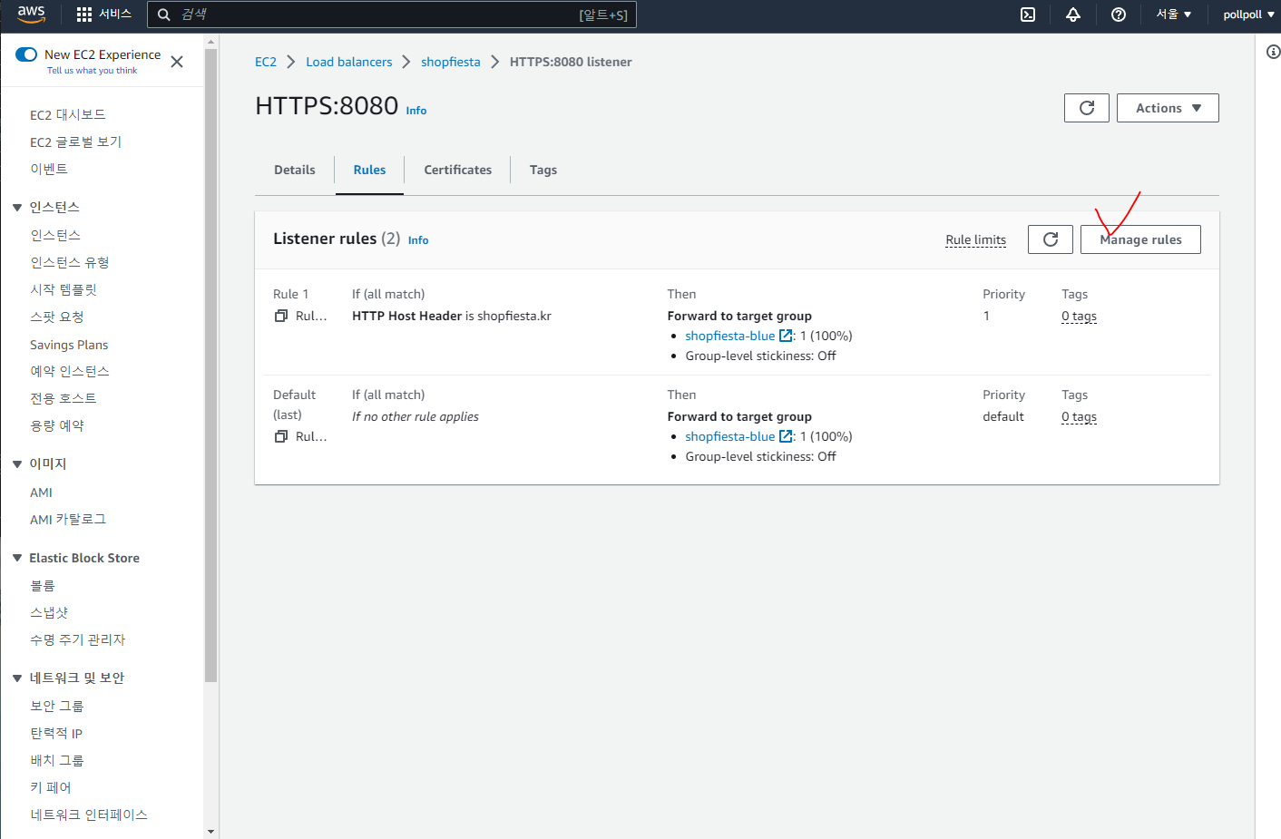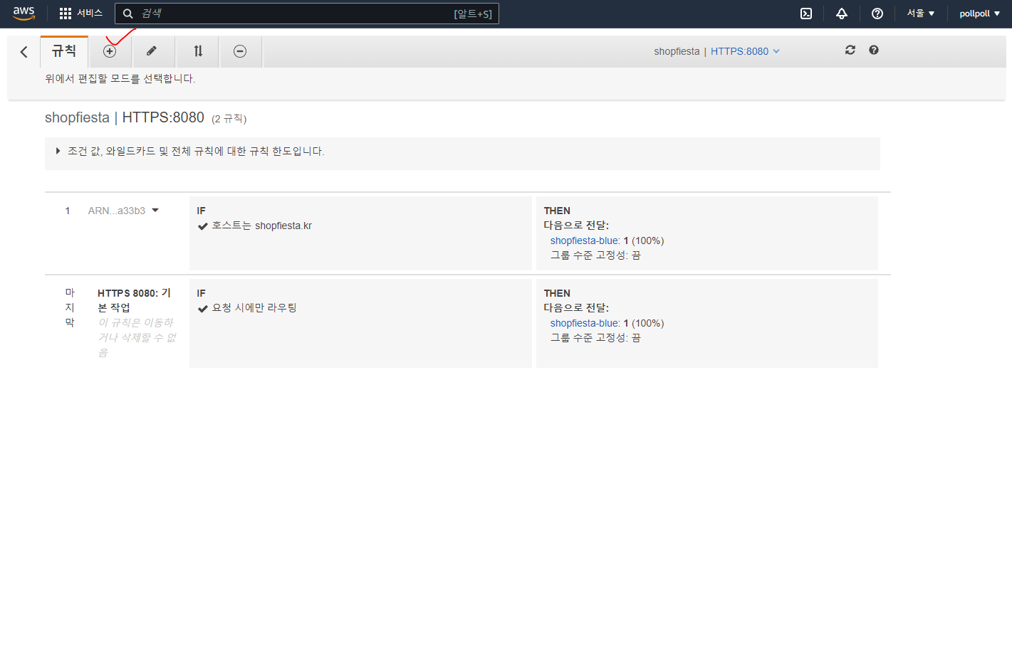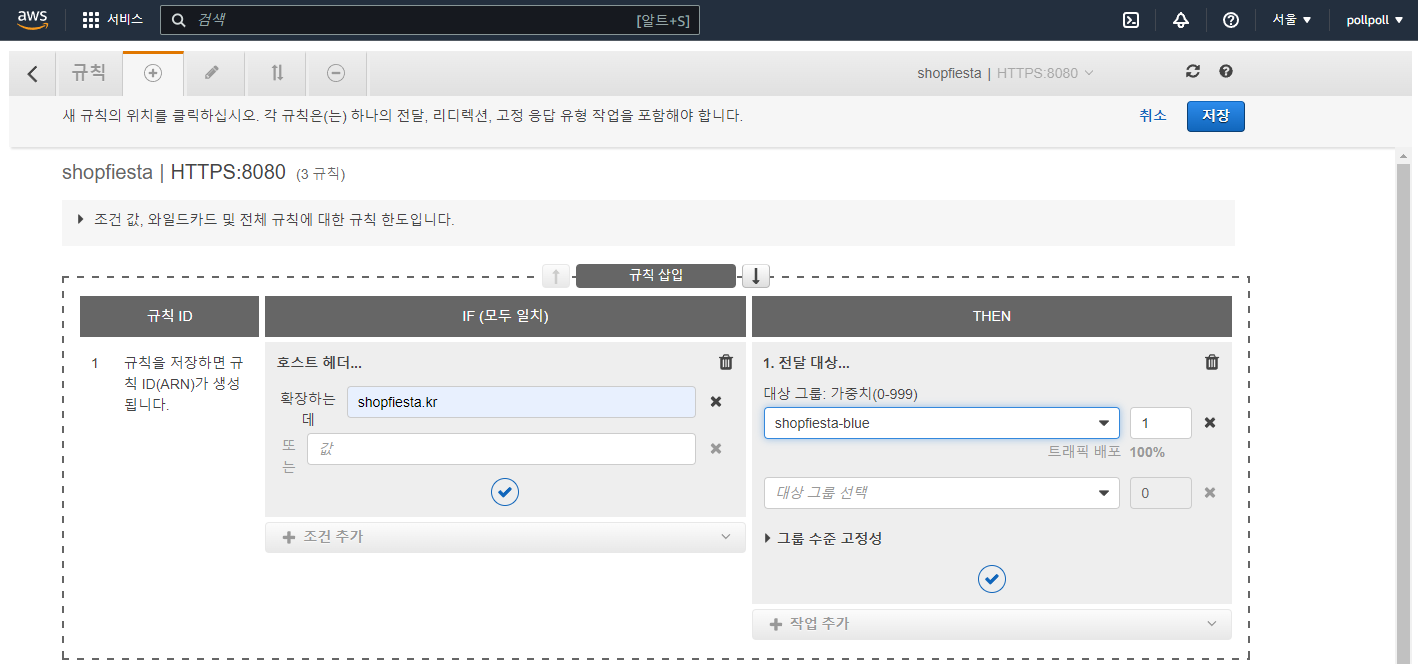 위와같이 설정해줍니다. IF 부분에는 호스트헤더 클릭 > 자신의 도메인 입력 > THEN 부분에는 전달 대상 클릭 > 우리가 만든 대상 그룹 선택