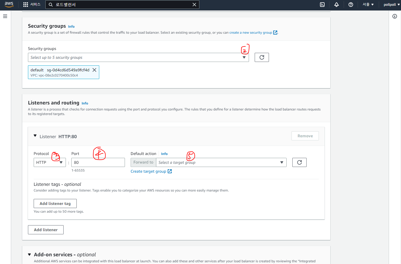 ③ HTTPS를 선택하고 ④ 어떤 포트로 매핑할 것인지 입력해줍니다. ⑤그리고 아까 우리가 만든 Target Group 을 선택해줍니다.
