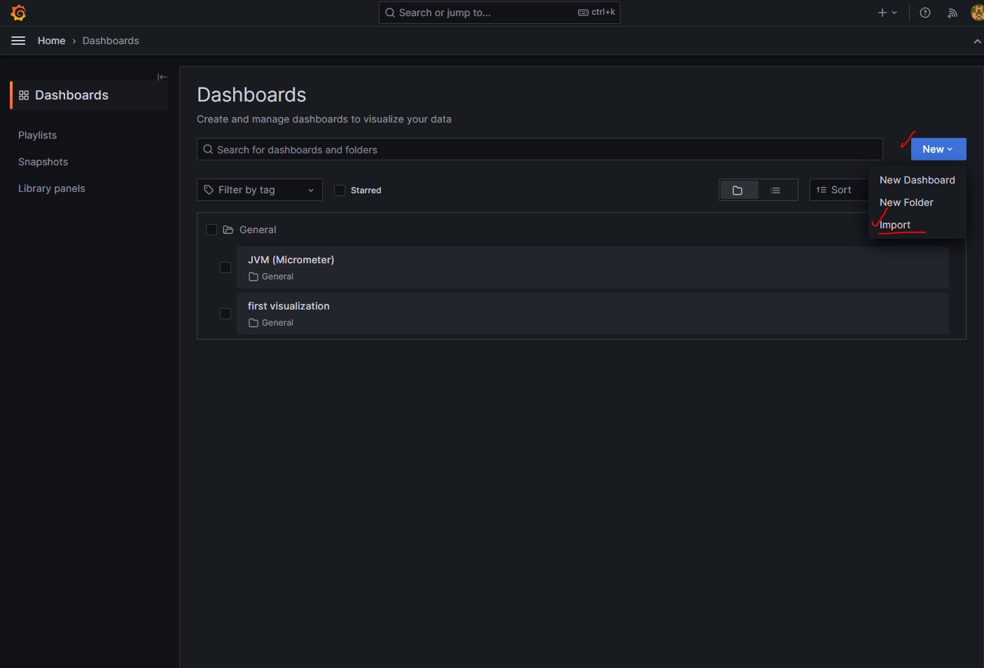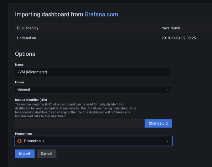 그리고 우리가 설정한 Data sources를 프로메테우스로 설정해준다음 import를 누르면!