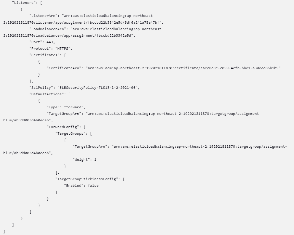 $ AWS_PAGER="" aws elbv2 describe-listeners --load-balancer-arn <YOUR-LOAD-BALANCER-ARN>