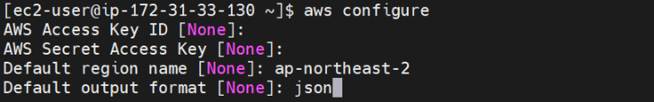 자신의 Access Key와 Secret Access Key를 입력하고 지역, 포맷을 입력하면 끝입니다.