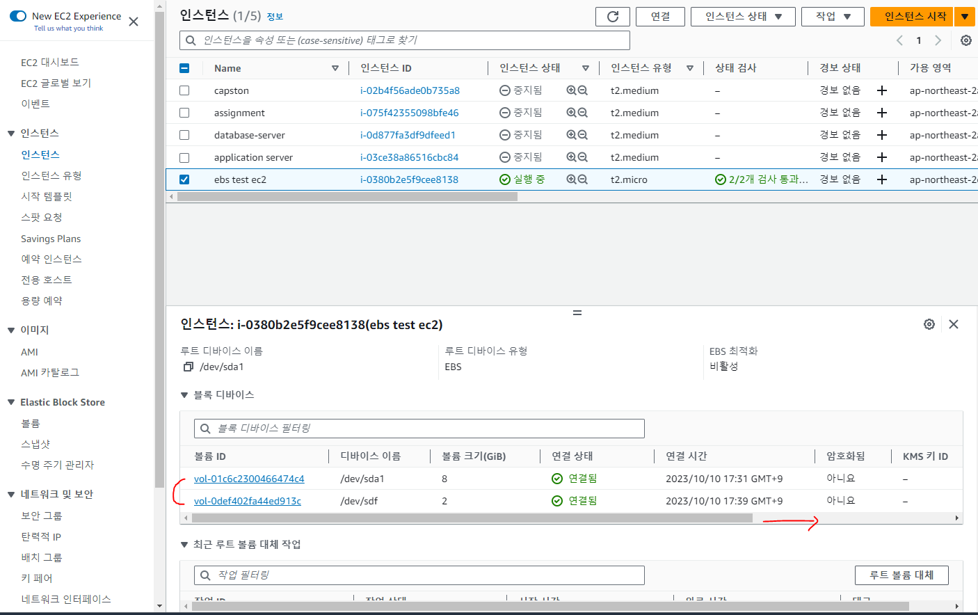 테스트삼아 루트볼륨과 EBS를 하나 설정했습니다. EC2 인스턴스와 연결된 스토리지들 설정 오른쪽에 보면?